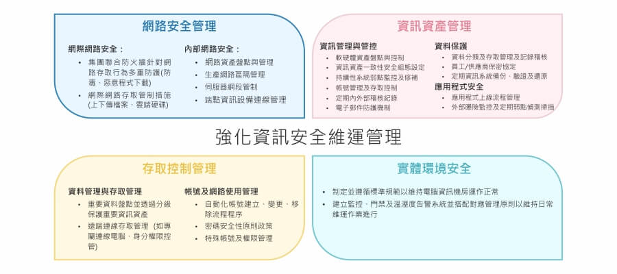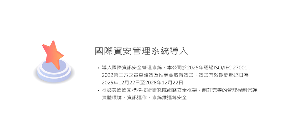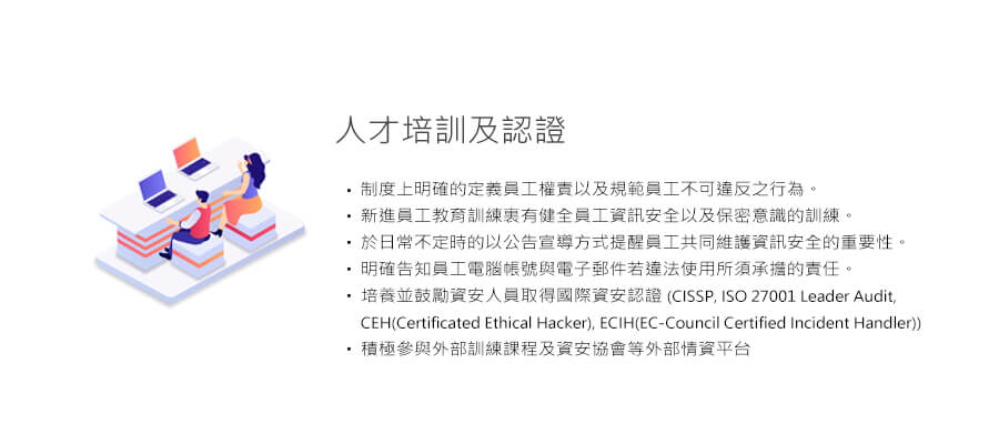 ‧ 持續投入資訊安全管理系統之必要資源,制定管理規範及流程,確保符合國際標準及業務需求。