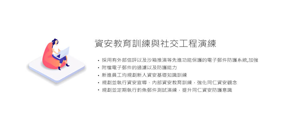 ‧ 致力維持資訊系統的機密性、完整性及可用性為目標,保護營業秘密及資訊資產,確保資訊環境安全無虞。