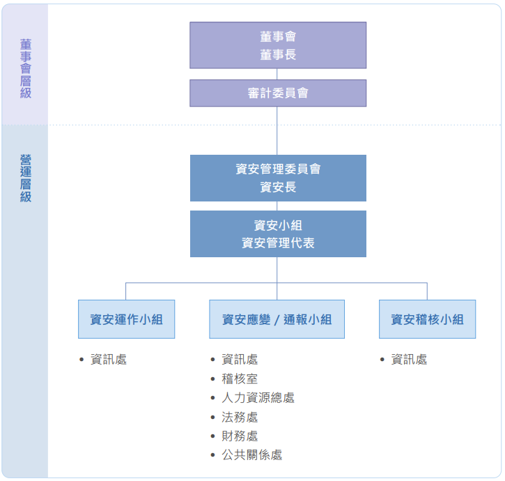 成立資安管理委員會,由資訊安全最高主管會同一階主管每半年召開會議,資安管理委員會會議,藉以檢視、討論、及決議資訊安全相關政策。